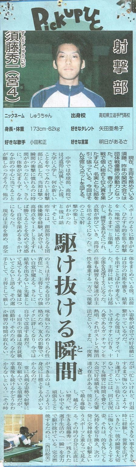 常に真剣な姿勢で射撃に取り組んでいる須藤だが、卒業後も続けるかどうかはわからないという。「その時にしかできない事をできる時に経験し、世界を広げていきたい」彼の瞬間を大切に悔いなく生きようとする姿。それは、的を外しても気持ちを切り替え、次の一発に全神経を注ぐ射撃というスポーツと重なって見える。その時の自分に正直に生きる須藤秀一。残された選手生活の「一瞬」を全力で駆け抜けている。完全燃焼するために。